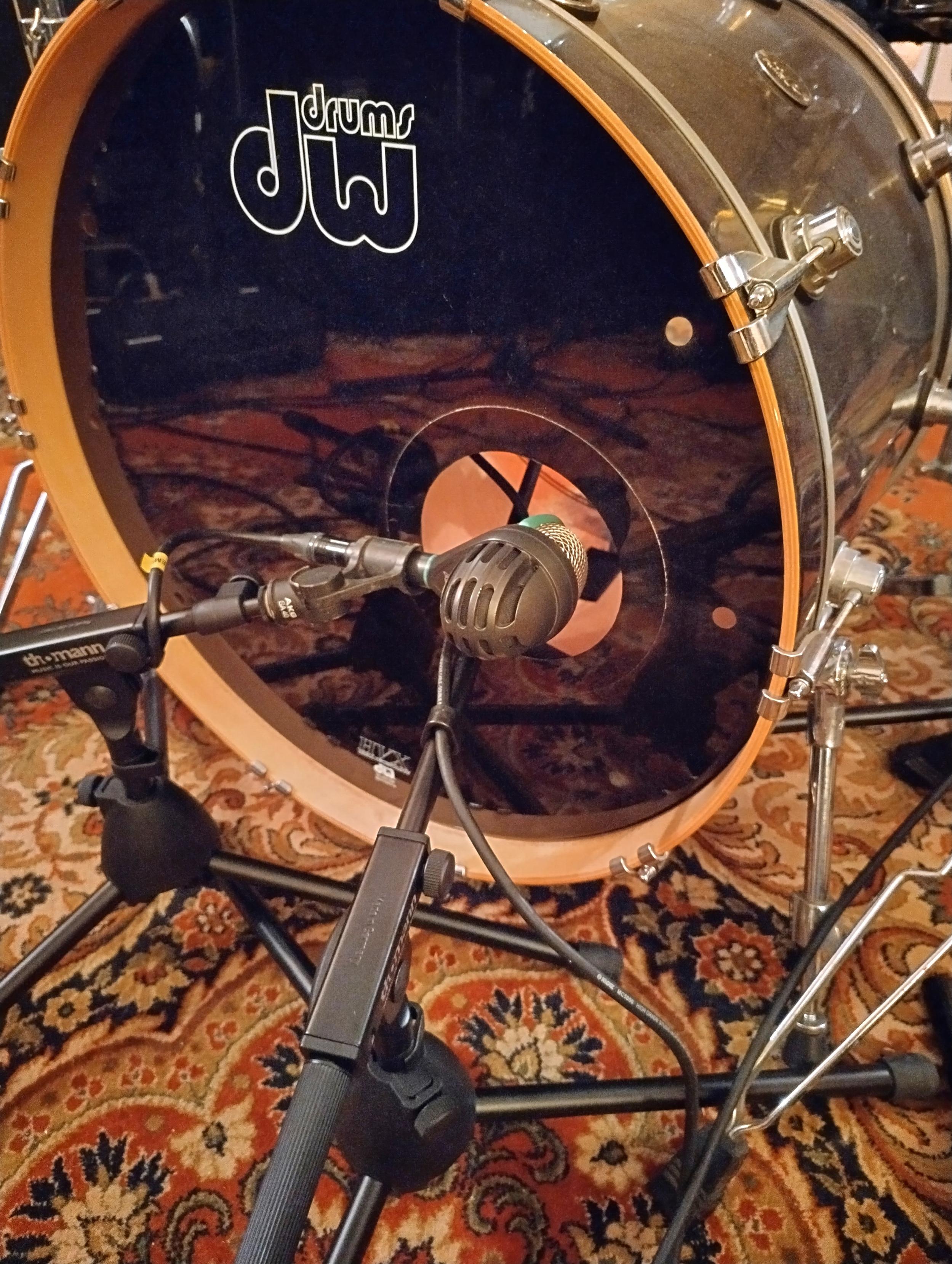 We're about to record something with @jeremy@mastodon.classicyou.nl ! Mic'd and tracked the drums. The drummer was really stoked about the tom mics, for him these Sennheiser MD421s (well, BF521s but those are basically the same) are the holy grail for toms.