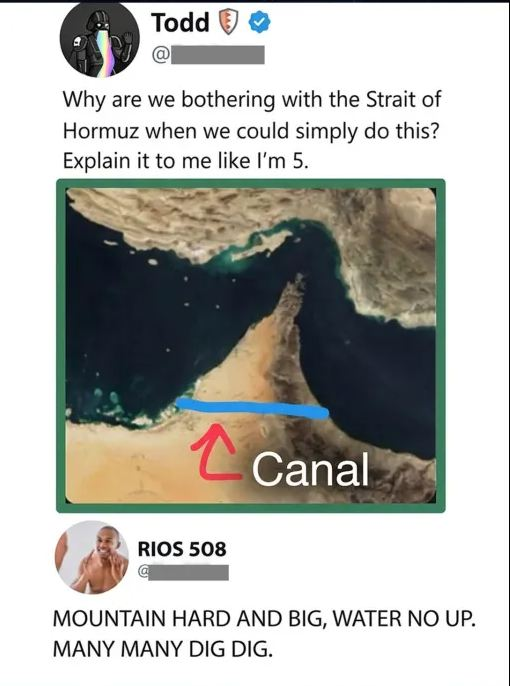 A map of the Strait of Hormuz, showing the sharp bend in the water where it flows around the pointy bit of Oman close to the Iranian shore. User Todd has drawn a blue line straight across the middle of the peninsula, from about Abu Dhabi to Sohar, and helpfully added a red arrow pointing to it labelled "Canal", with the comment "Why are we bothering with the Strait of Hormuz when we could just do this? Explain it to me like I'm 5".