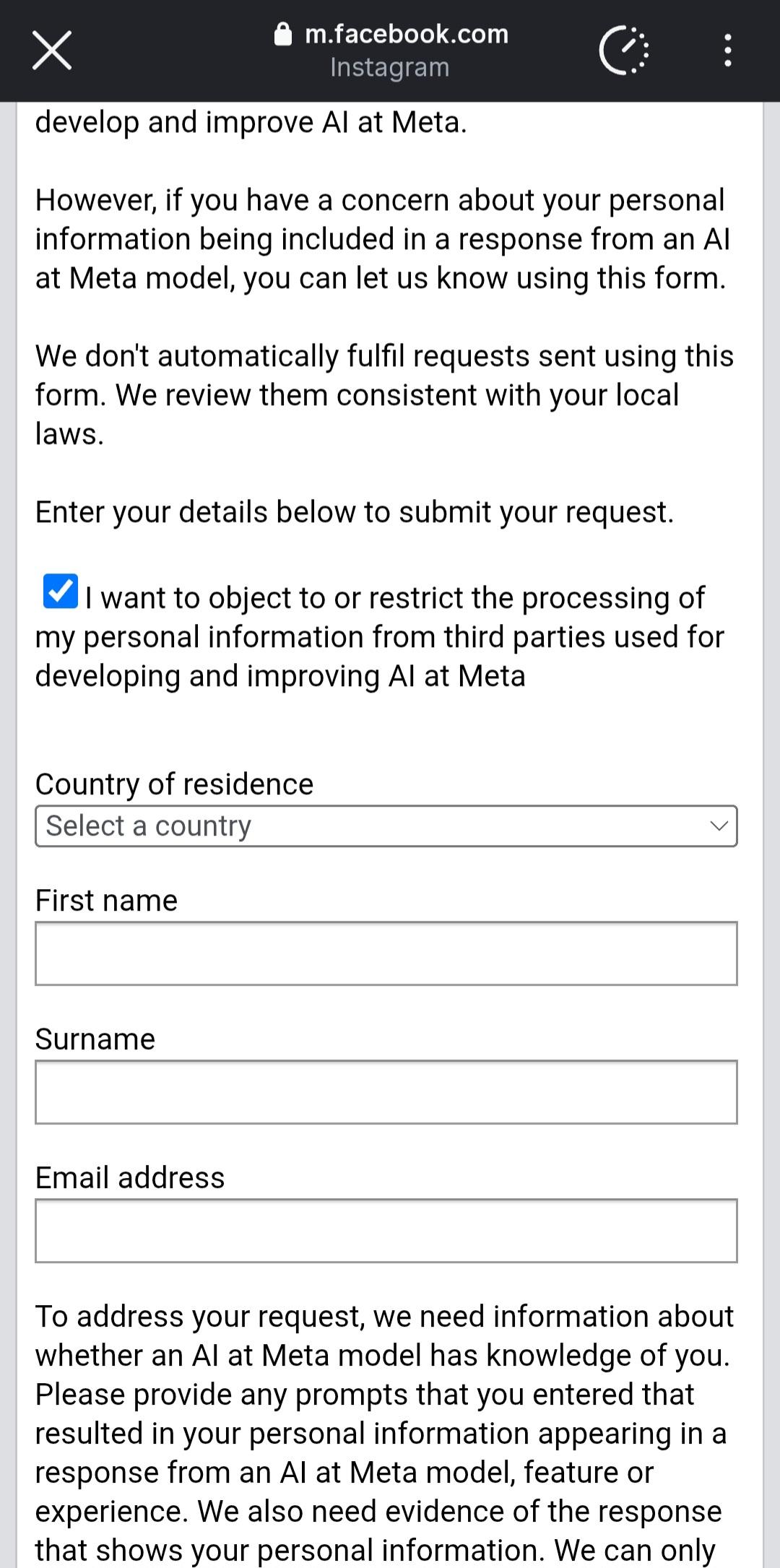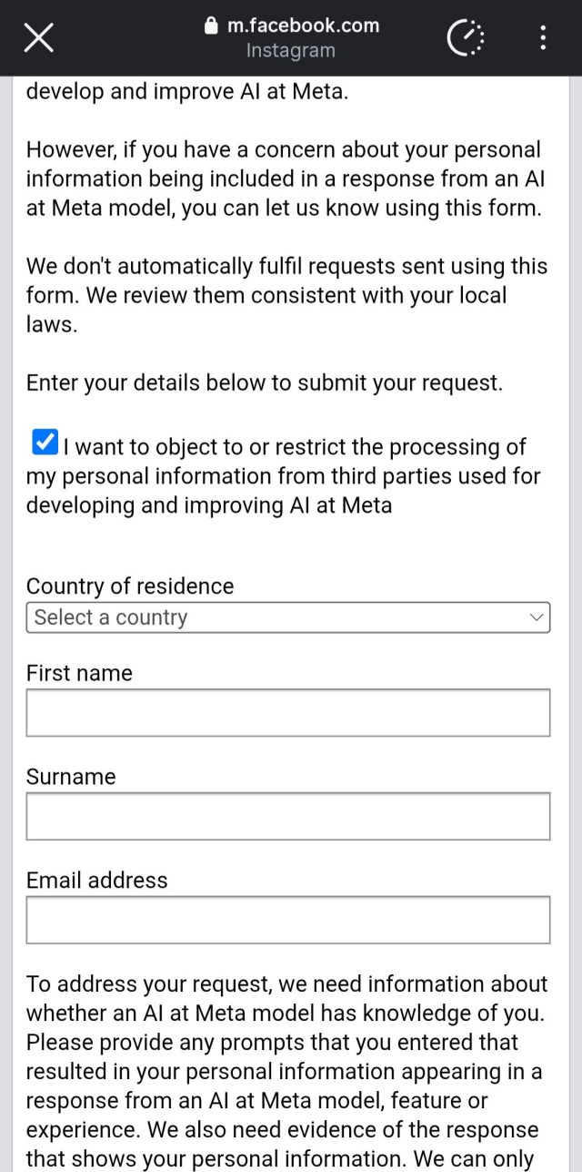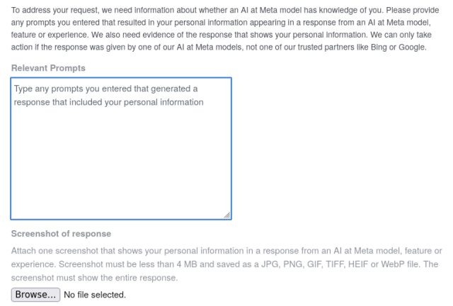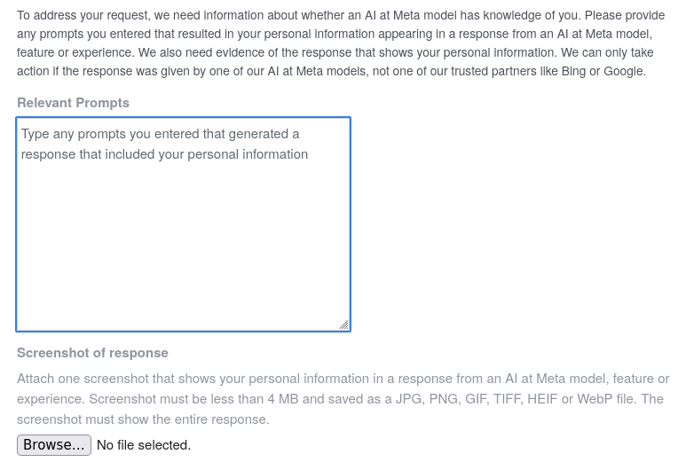 in reply to Tuta • • •It gets even more ridiculous! They request that you provide them with *evidence* "..about whether an AI at Meta model has knowledge of you."