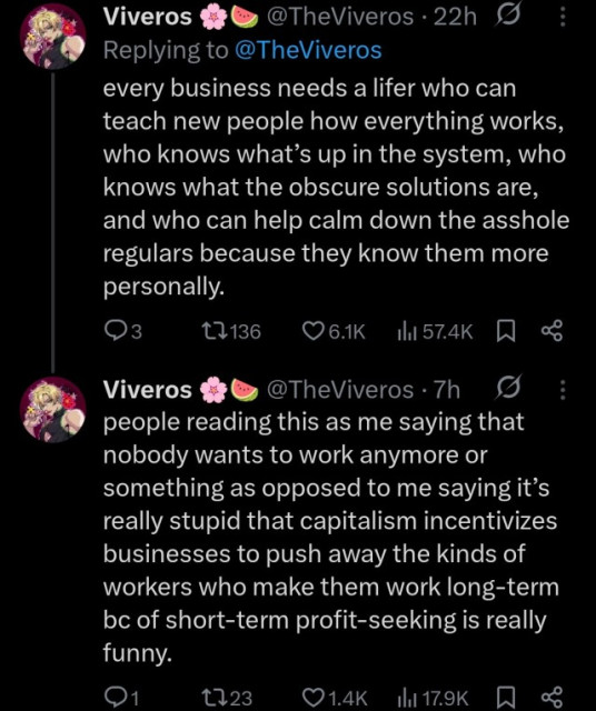 In response, Viveros (a content creator from Alberta and one of the 4m people who saw the original tweet), replied with a short thread about the value of people like this, who "keep the lights on and the business functioning at everything from restaurants to post offices but now nobody’s interested in hiring them":