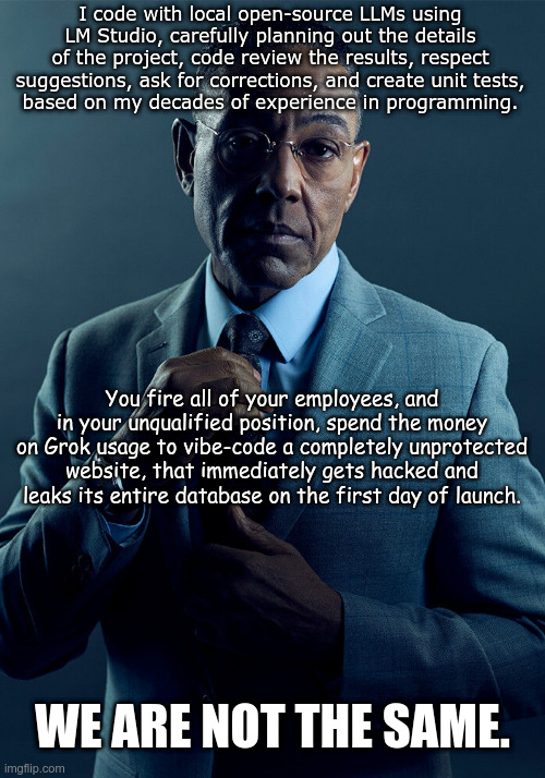 in reply to panda_abyss • • •Exactly. It should all be treated as another tool in the toolbelt. To me, it reminds me of when GUI editors came along in IDEs like Visual Studio. It honestly feels the same. Tech CEOs immediately clamor to say that tech jobs are dead, the market for engineers dips. Engineers freak out and refuse to learn the technology while others learn what it is. Those who learn and use it as a tool elevate themselves and move faster. There is a non-trivial group of people who refuse to use the GUI tools on principal. Eventually the CEOs realize they made a mistake, and then more work comes in faster than ever before. Eventually over the years/decades everyone starts using the tech as a tool.