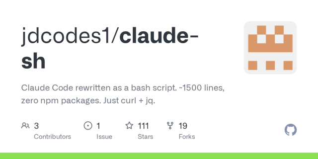 in reply to Kwakigra • • •GitHub - jdcodes1/claude-sh: Claude Code rewritten as a bash script. ~1500 lines, zero npm packages. Just curl + jq.