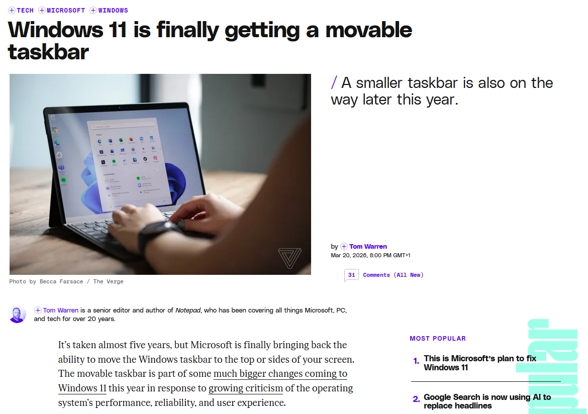 Microsoft is finally letting Windows 11 users move the taskbar around. You’ll soon be able to position the taskbar at the sides of your screen or at the top.Tom Warren (The Verge)