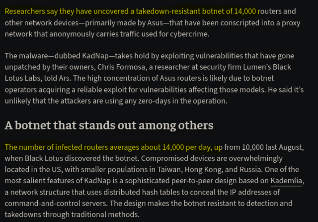 in reply to Onno (VK6FLAB) • • •Well the article says the botnet is infecting 14,000 routers and other devices a day. Not that there are only 14k infected routers in the world.