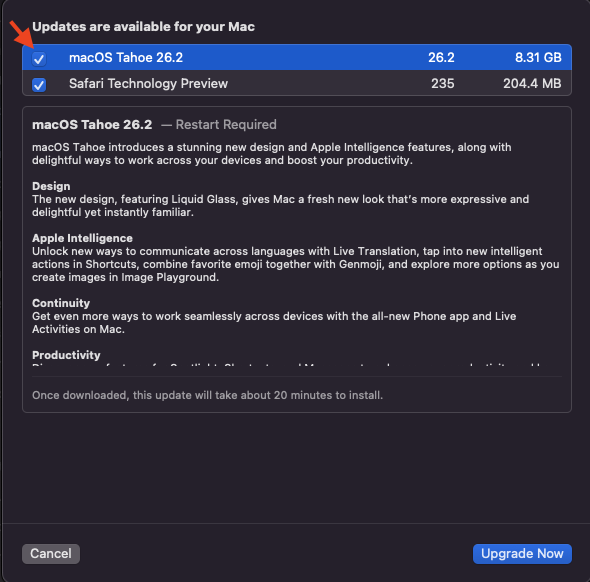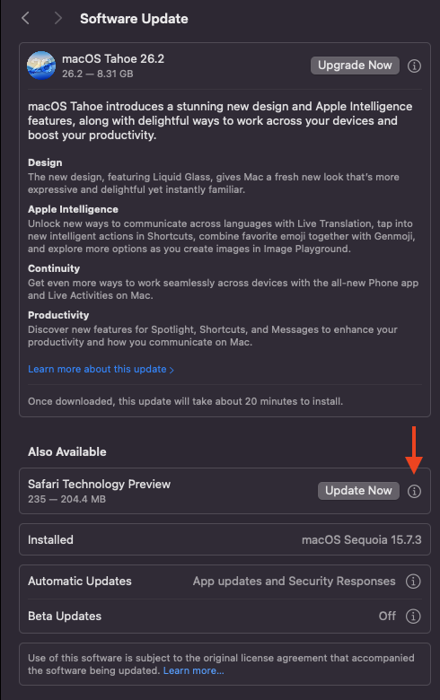 Also this… If you have no interest in downgrading to Tahoe but are tempted to update the Safari Techology Preview, it will install both without notice or consent unless you first click the info button to deselect Tahoe.