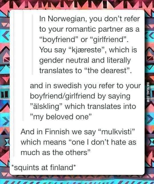In Norwegian, you don’t refer to your romantic partner as a “boyfriend” or “girlfriend”. You say “kjzereste”, which is gender neutral and literally translates to “the dearest”.