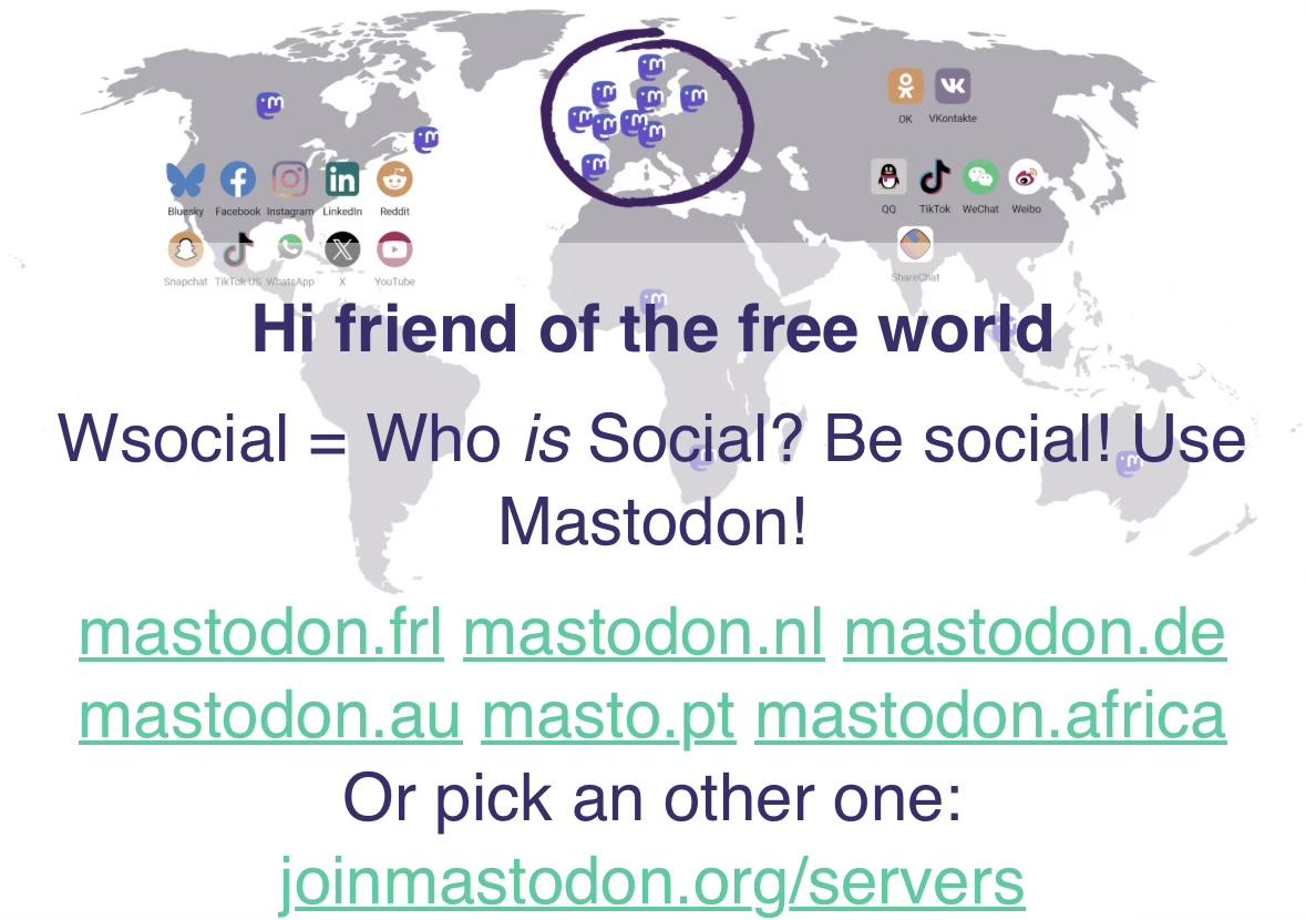 The "brilliant" minds behind the new social network wsocial.eu forgot to grab related domain names, so I applaud the efforts of the creator of w-social.eu... encouraging people to be social and simply join the fediverse.