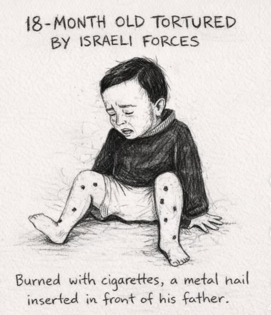 18-month-old Palestinian child, identified as Karim Abu Nassar, was tortured by Israeli soldiers in Gaza. According to these reports, the child was subjected to cigarette burns and had a nail inserted into his leg in front of his father, Osama Abu Nassar, during an interrogation. The purpose of this torture was to pressure the father into making a confession. 1)