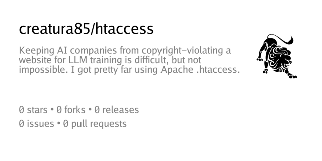 Here's a repo that blocks AI crawlers on webserver level, in this case Apache: codeberg.org/creatura85/htacce…