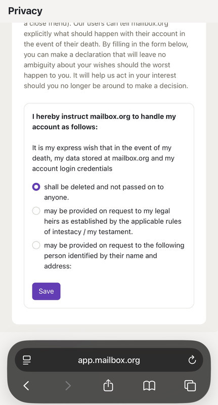 in reply to Da Cap’n • • •It's preemptive for when you DIE. That's why in the screenshot you sent it says "in the event of my death", not "if the government comes knocking, violate the law and delete my data first".