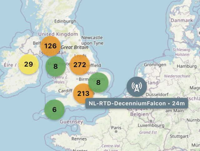 A #MeshCore repeater located in the UK popped up on the app's "Discover" map. Not all nodes are shown here, so there are probably a couple near Calais that help achieve this.