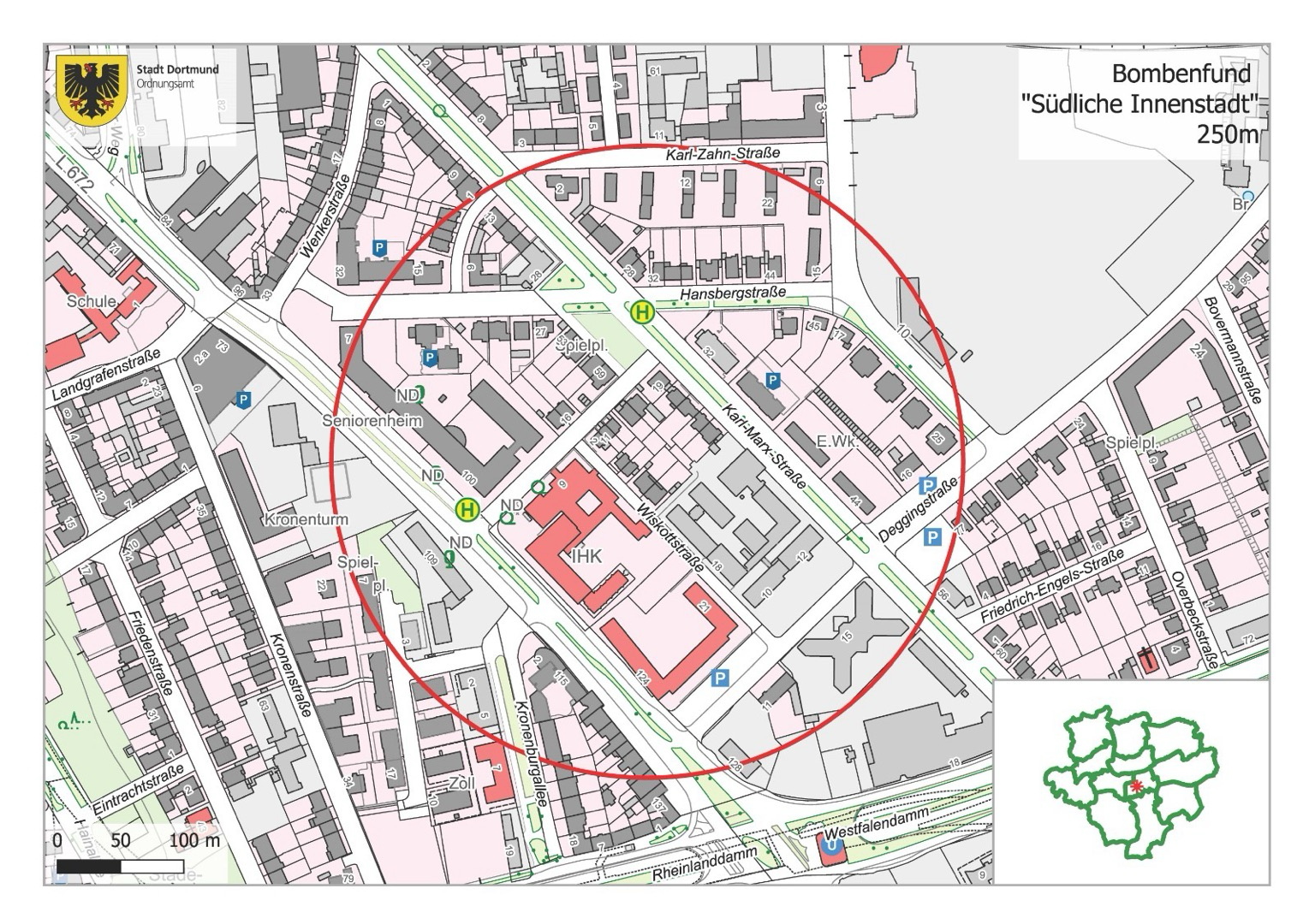 in reply to Stadt Dortmund • • •Es wurde ein 250 kg schwerer Blindgänger aus dem Zweiten Weltkrieg gefunden. Zur Sicherheit wird das umliegende Gebiet in einem Radius von 250 Metern ab sofort evakuiert. Die Personen in diesem Kreis müssen nun ihre Häuser und Wohnungen verlassen. Das wird das Ordnungsamt kontrollieren. Es können Evakuierungsbusse genutzt werden. Alle Infos im Ticker!