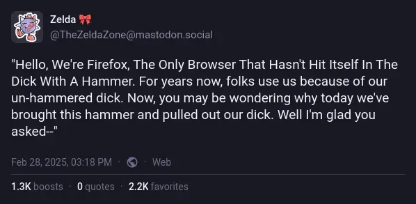 in reply to SwooshBakery624 [they/them] • • •This will be a big boost for the new engines currently in development and the popularity of Librewolf.