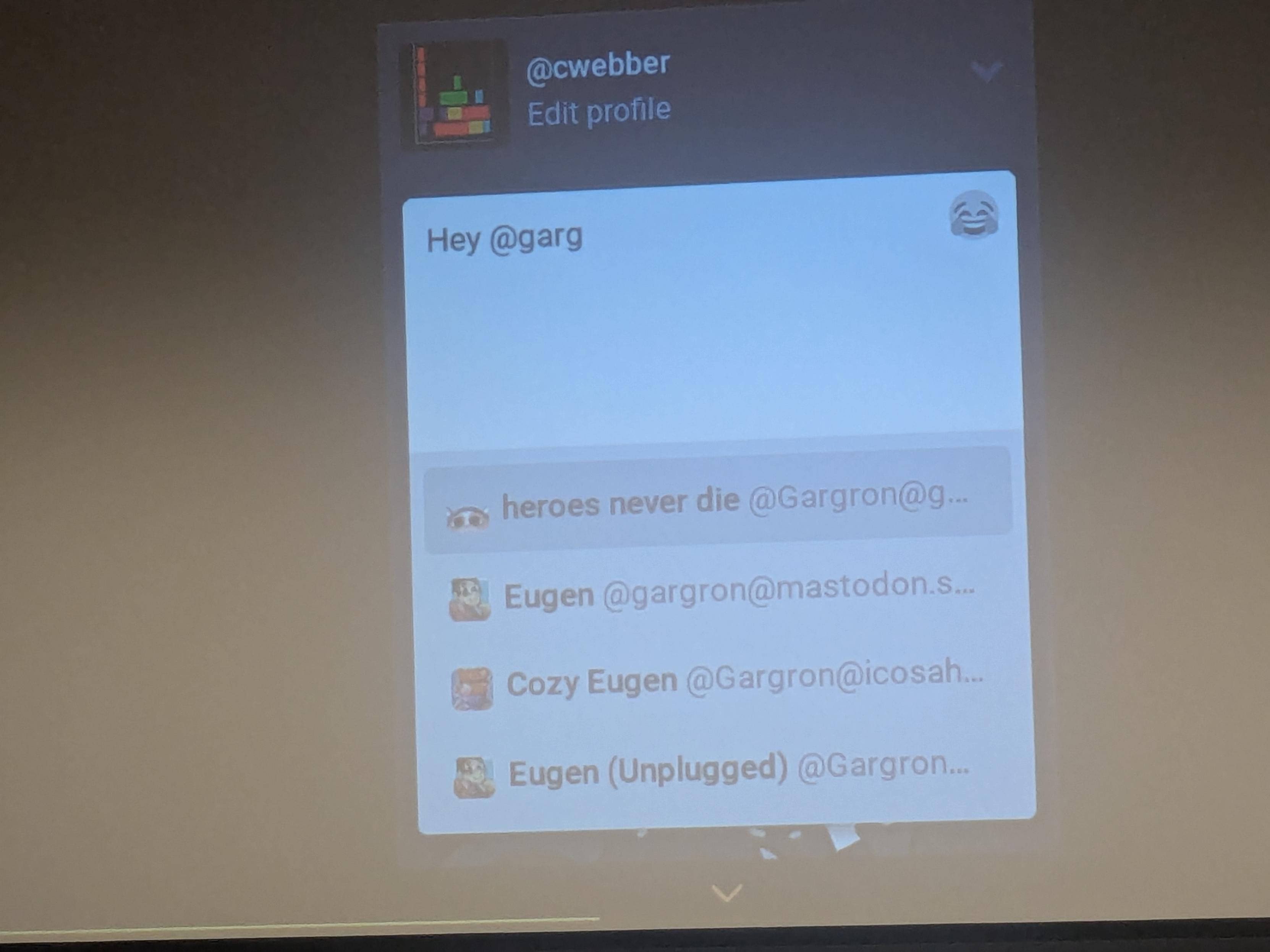 @tsyesika is talking about issues with naming and fishing and has a slide up with a fake @Gargron account