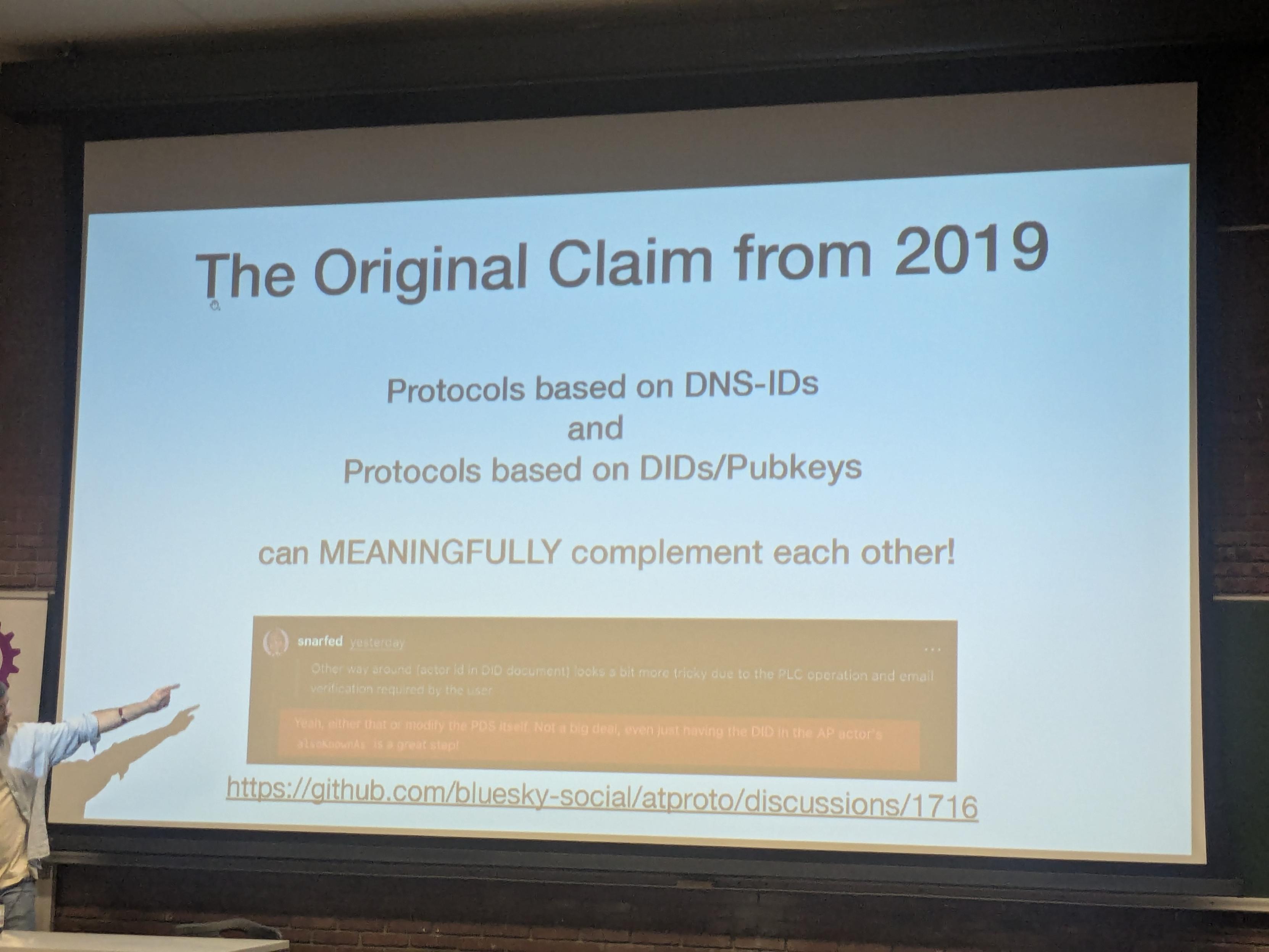 A slide of @snarfed.org agreeing with the premise of bringing DIDs to the fediverse