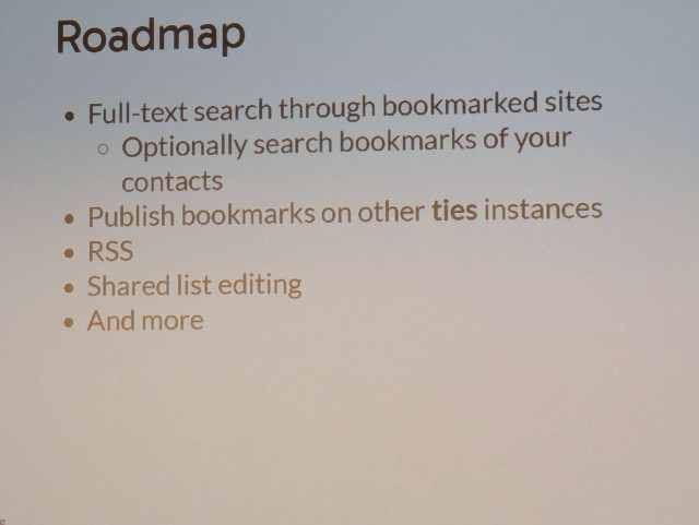 After a short break we have @raffomania is presenting a new federated bookmark sharing software called 'ties'
