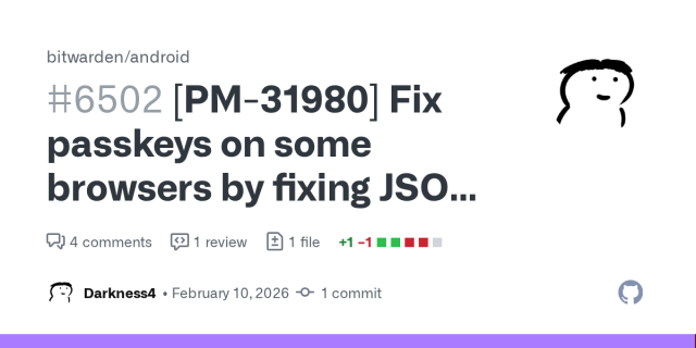 in reply to Irfan Kitsune-chan • • •[PM-31980] Fix passkeys on some browsers by fixing JSON parsing by Darkness4 · Pull Request #6502 · bitwarden/android