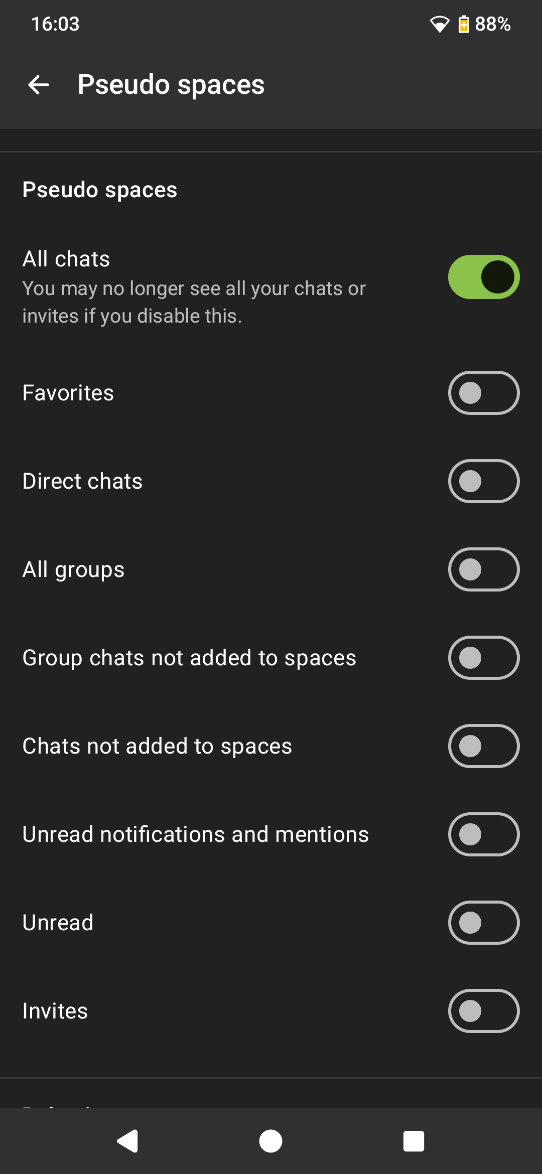 It has a "pseudo space" feature which allows grouping by a set of predefined filters and the filter "chats not added to spaces" would give you this. This pseudo space will then show up under the name "space orphans" :D