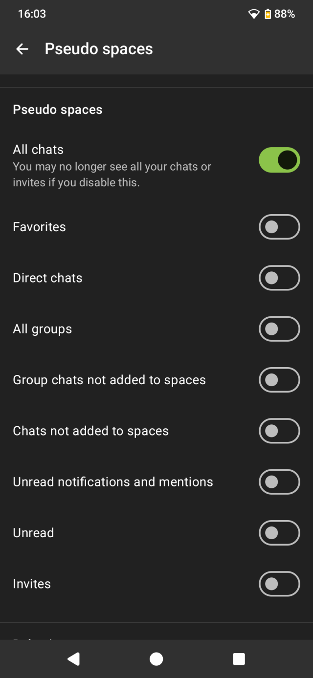 This just... Kind of feels like a more centralized XMPP with group chat folders that sort of function? The spaces feature is neat, but I've tried 4-5 clients, and every single one of those throws all of them into the same screen as the DMs by default, and I can't find a way to change that.