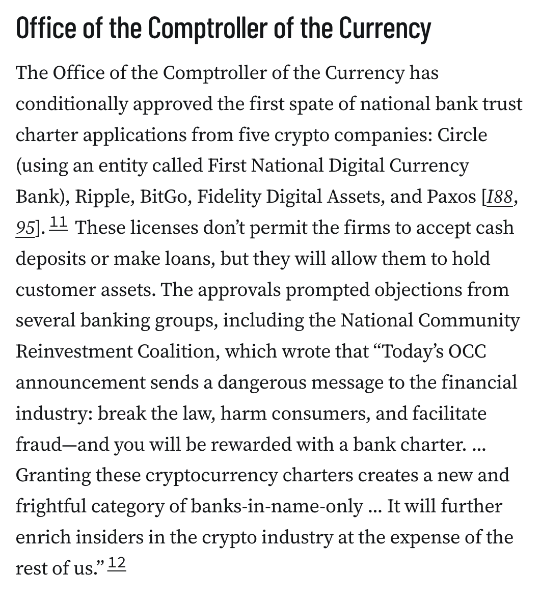 The OCC has approved the first five national trust bank applications by crypto firms Circle, Ripple, BitGo, Fidelity Digital Assets, and Paxos. This gives them a stronger foothold in traditional finance, confers regulatory legitimacy, and preempts some state financial laws.