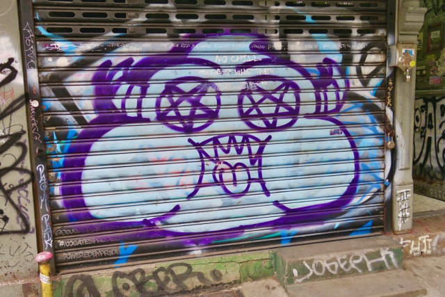 Graffiti art of a person with big cheeks, seen on a metal door in New York, New York....