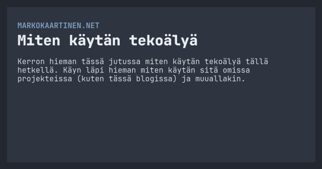 Kerron hieman tässä jutussa miten käytän tekoälyä tällä hetkellä. Käyn läpi hieman miten käytän sitä omissa projekteissa (kuten tässä blogissa) ja muuallakin.