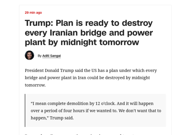 #Trump says he’s “not at all” concerned about committing #WarCrimes as he continues to threaten destruction of Iran’s #bridges & #PowerPlants if they don’t meet a Tuesday-evening deadline to reopen the #StraitOfHormuz.