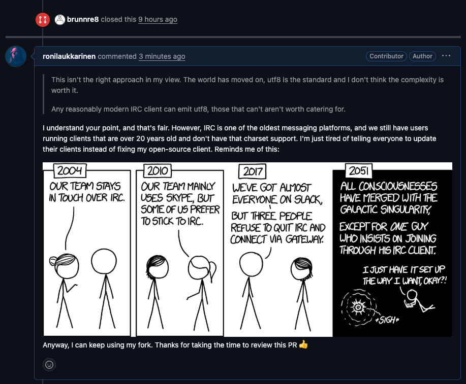 Well, that's the beauty of open source, I can just keep working on my fork. Couldn't resist posting an XKCD comic in my response though.