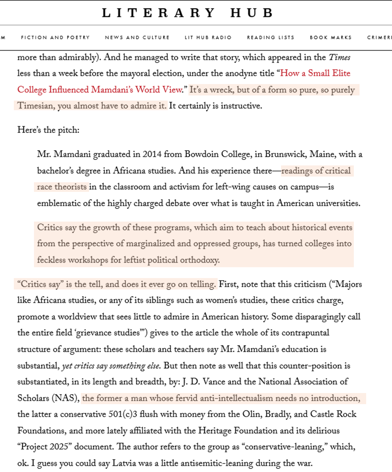 "And he managed to write that story, which appeared in the Times less than a week before the mayoral election, under the anodyne title “How a Small Elite College Influenced Mamdani’s World View.” It’s a wreck, but of a form so pure, so purely Timesian, you almost have to admire it. It certainly is instructive."