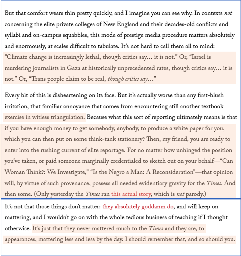 "It’s not that those things don’t matter: they absolutely goddamn do, and will keep on mattering, and I wouldn’t go on with the whole tedious business of teaching if I thought otherwise. It’s just that they never mattered much to the Times and they are, to appearances, mattering less and less by the day. I should remember that, and so should you."