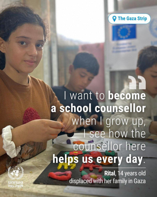 “We draw, we shape the clay, we colour it, we laugh. Those are the best moments of my day,” says 14-year-old Rital, living in an UNRWA school-turned-shelter with her family in #Gaza.