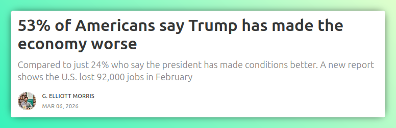 While just 24% say he has made it better. The U.S. lost 92,000 jobs in FebruaryG. Elliott Morris (Strength In Numbers)