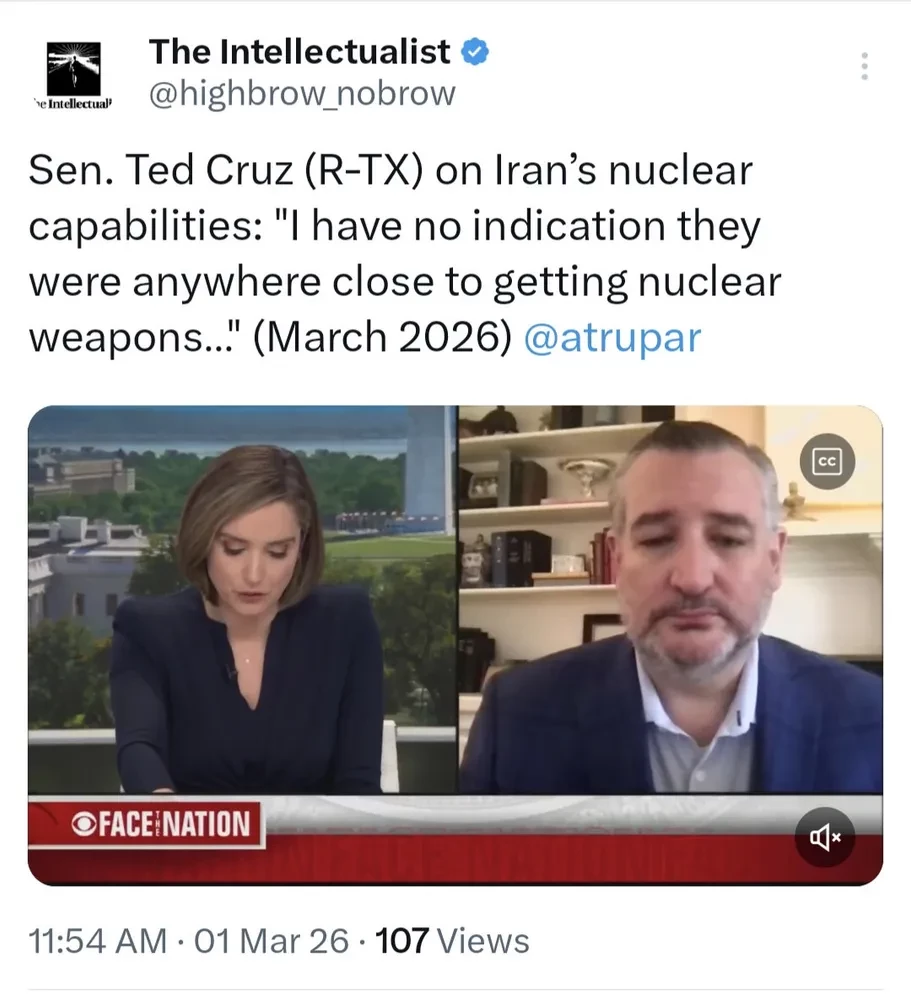 "Consider this week in full. The abominable Easter Sunday social media post that dropped the f-bomb and mocked Islam. The far more abominable post two days later about destroying one of history's most accomplished civilizations. The complete and utter backing down from it hours later. The phantom ceasefire, which Netanyahu obviously intentionally wrecked."