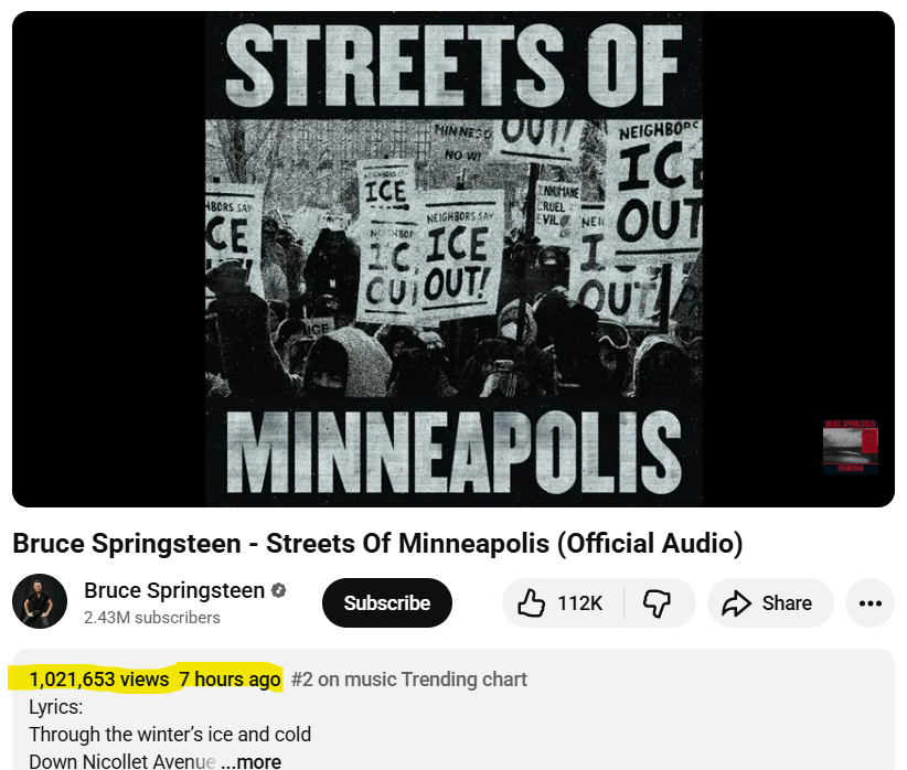 Breaking: Bruce Springsteen's Protest Song 'Streets Of Minneapolis' Registers An Incredible One Million Views on YouTube in Only Seven Hours
