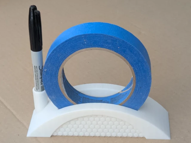 Download this free 3D print file designed by RavenX. A tabletop or shelf caddy for holding a roll of 1" tape and a marker or grease pencil. Sized to fit a standard Sharpie marker.makerworld.com