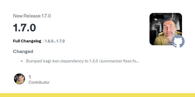 Full Changelog: 1.6.0...1.7.0 Changed Bumped kagi-ken dependency to 1.3.0 (summarizer fixes for Kagi's updated streaming API format) Removed Obsolete docs/ directory and references to it in READMEGitHub