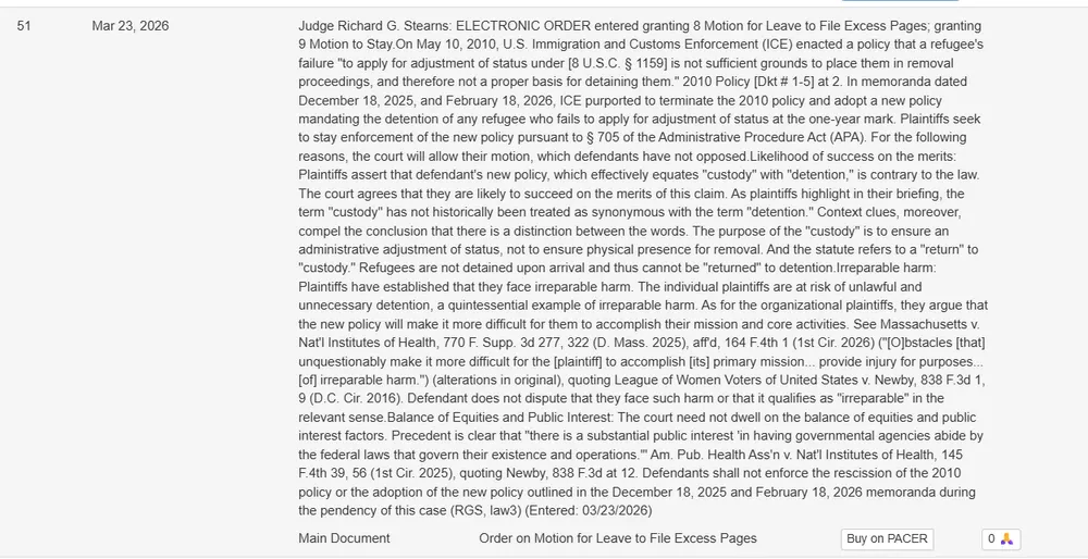 Judge R Stearns in Boston has⚡blocked the Trump admin from🚨enforcing a new policy that'd subject 1000s of refugees to arrest & detention if after a year in the US they'd yet to obtain green cards."