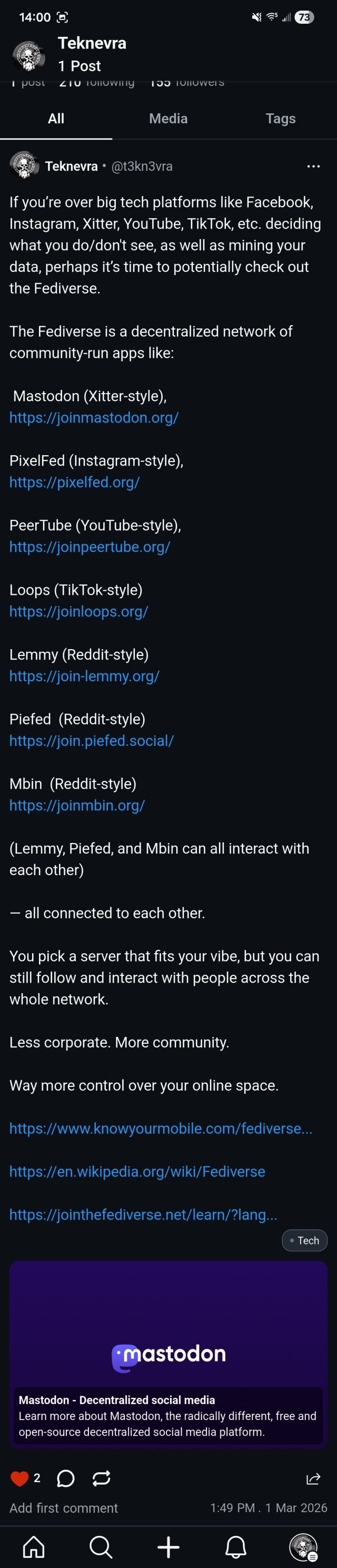 I start a blog - #TheFutureIsFederated - to explain the fediverse to "normies"... and I make a lot of new (techie) friends.