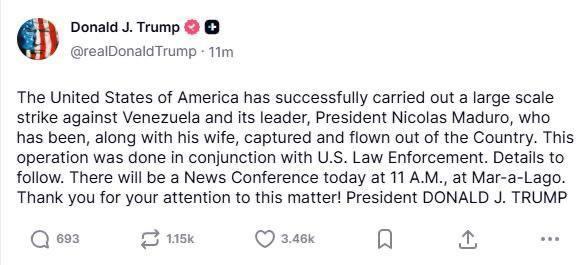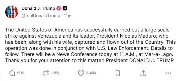 Trump posts image of himself saying he is the "Acting President of Venezuela."