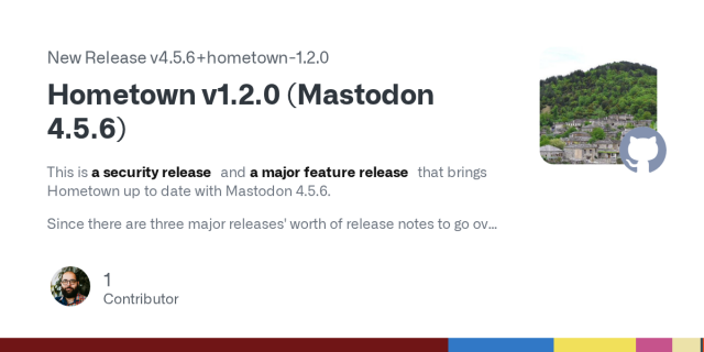 This is a security release and a major feature release that brings Hometown up to date with Mastodon 4.5.6. Since there are three major releases' worth of release notes to go over, there are too ma...GitHub