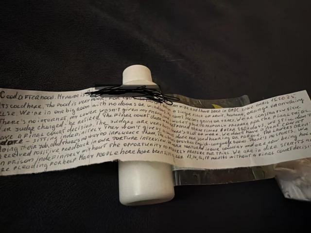 “It’s cold here all the time and the food is poor,” the missive continues. “For 280 days we haven’t eaten a single piece of fruit, banana, apple, orange, or anything fresh. We are all in one big room with no doors or windows. We can’t see any grass or trees. We are all constantly sick.”
