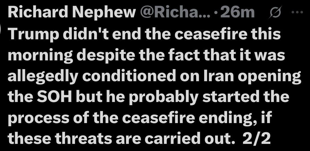 All I can think of is this is another extortion/market manipulation scheme. Iran still has full control of the Strait. I’m looking forward to Trump reversing this and allowing the markets to bounce again, enriching speculators.