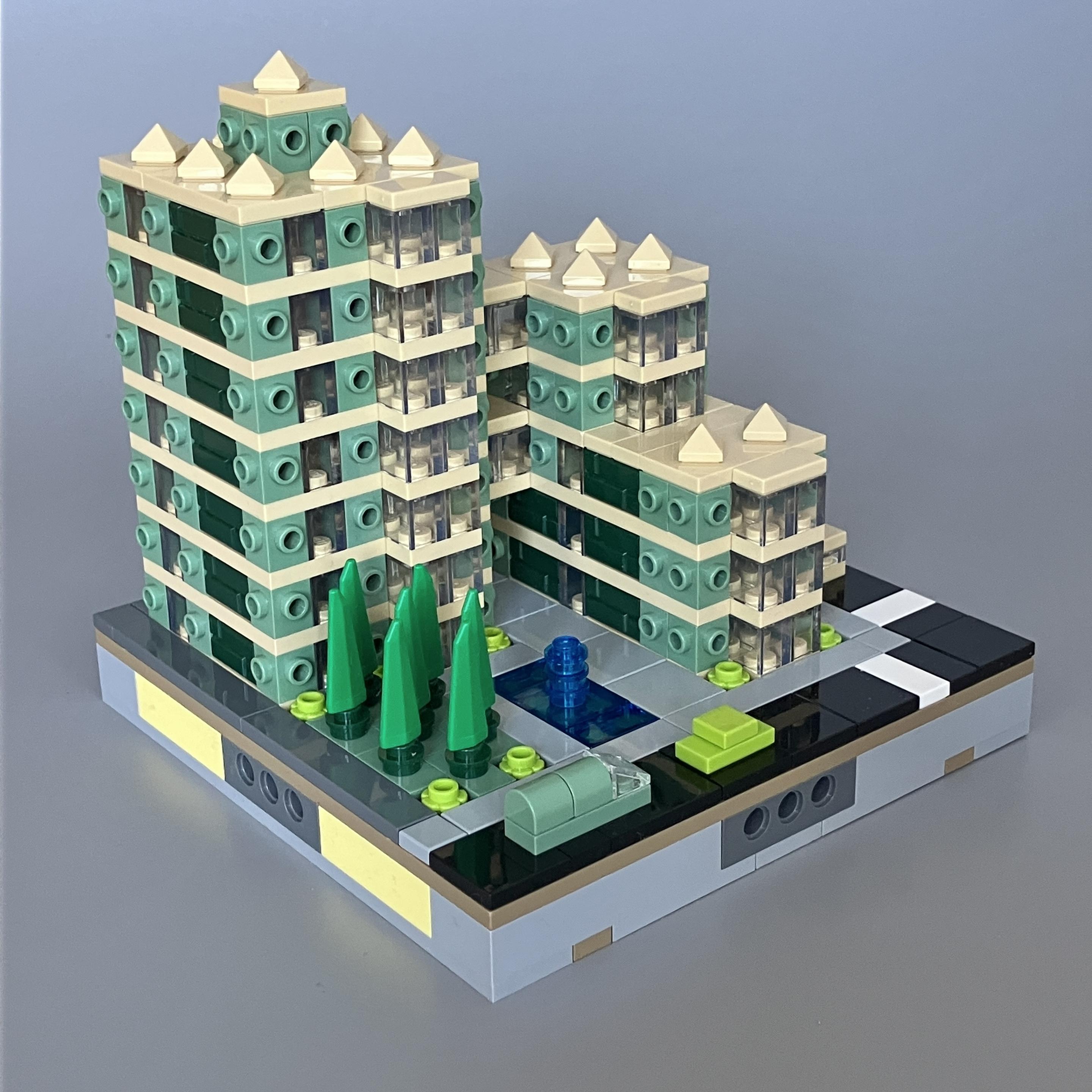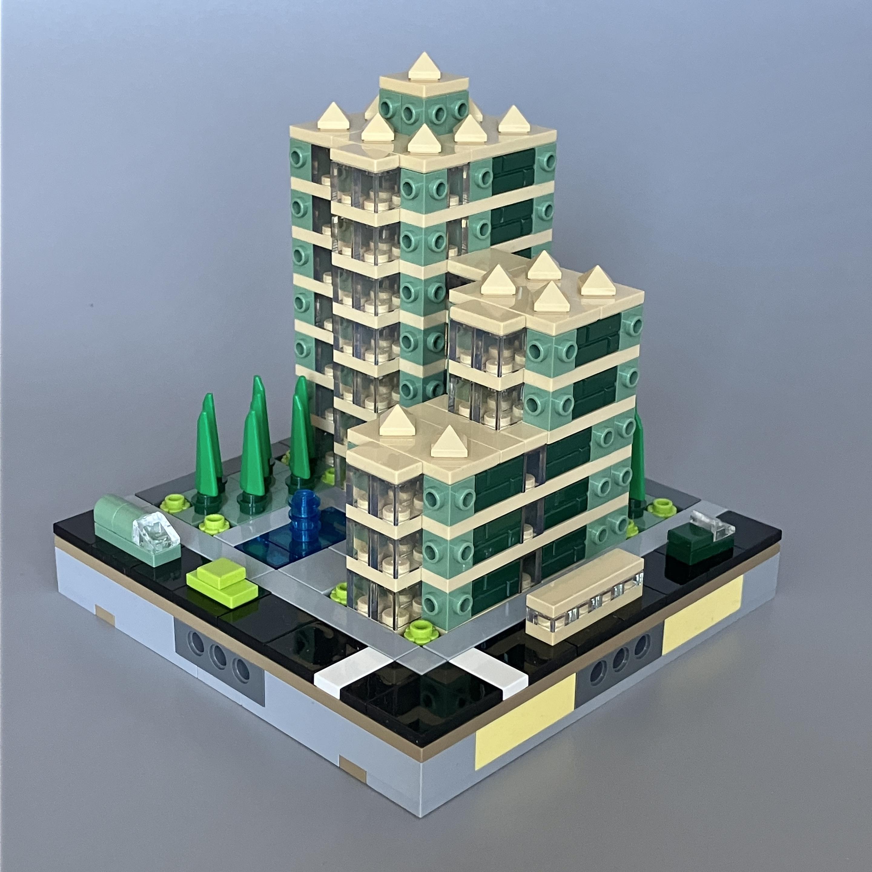 I was inspired to make another #Micropolis build last night. More social housing, I think. Conifer Court has some pleasant grounds and even a little fountain!
