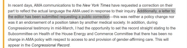 American Medical Association Requests Correction to New York Times Story