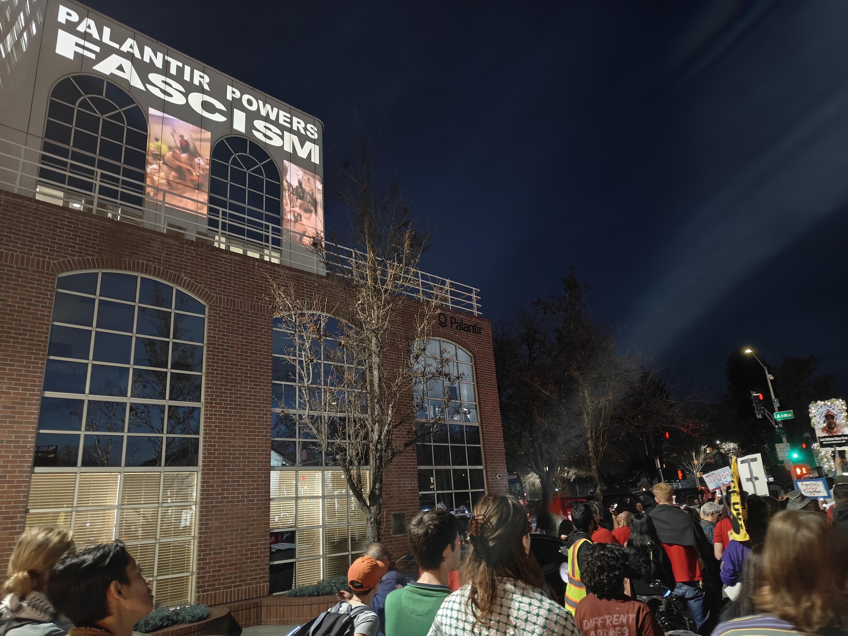 Happening now in Silicon Valley: marchers have surrounded the Palantir building and are holding a prayer vigil for victims of ICE, while video of ICE and Palantir crimes is projected on the building. #AbolishICE #ICEOut #Palantir #PaloAlto