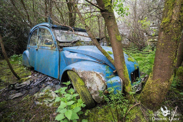 1966 Citroen 2CV, seemingly locked in a decades long battle with a tree! Somewhere in England.
