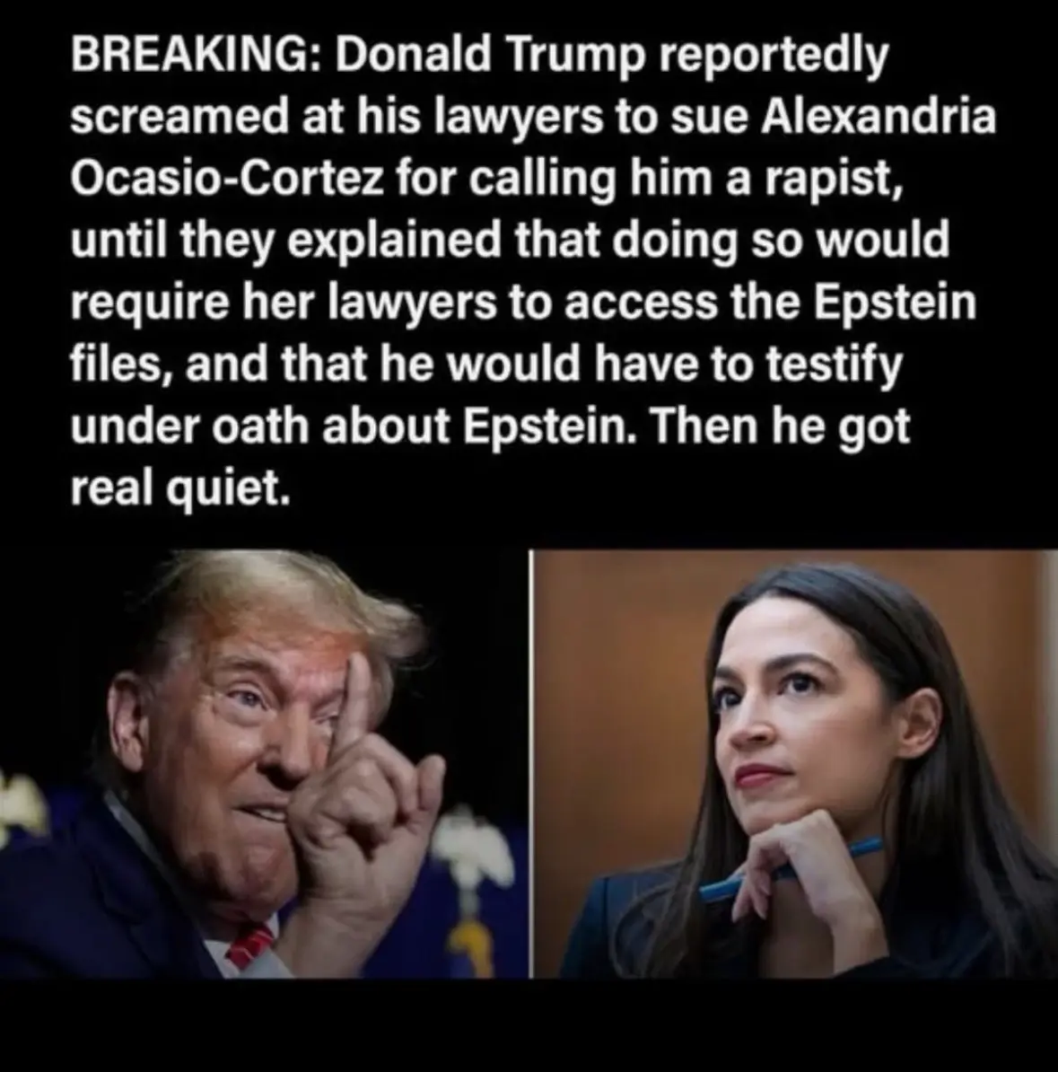 Orange Rapist screamed at his lawyers to sue Alexandra Ocasio-Cortez for calling him a rapist until they explained that doing so would require her lawyers to access the #TrumpSteinFiles and that he would have to testify under oath about #Epstein.