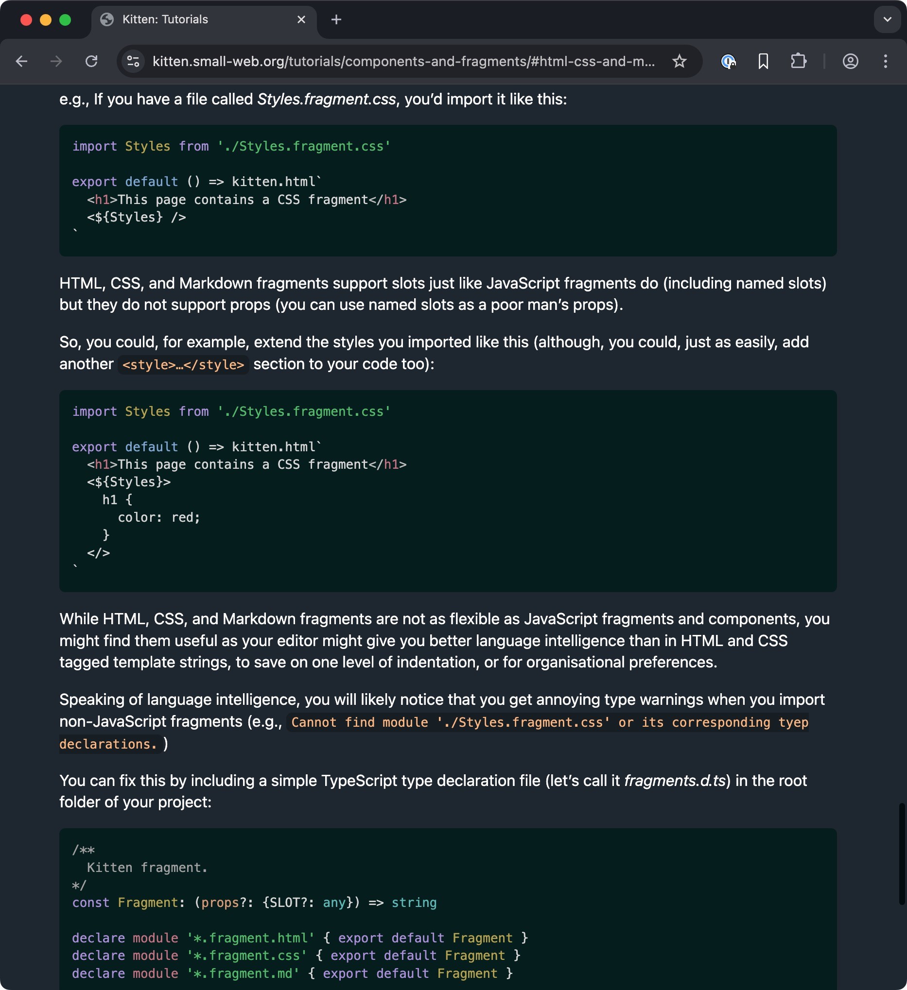 Added information on HTML, CSS, and Markdown Fragments to the Kitten Components and Fragments tutorial, including a little TypeScript type declarations file you can add to your projects so you donāt get type warnings for them when you import them in your projects: