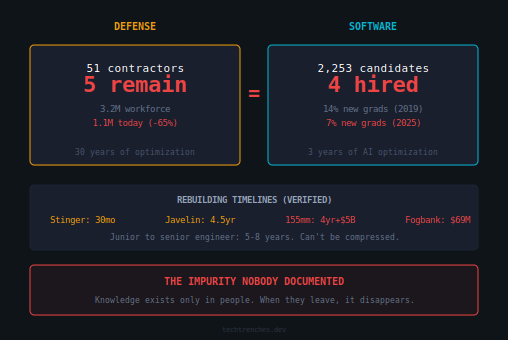 The defense industry lost the ability to make weapons when crisis hit. The same pattern is eroding software engineering skills. The timelines are identical.Denis Stetskov (From the Trenches)