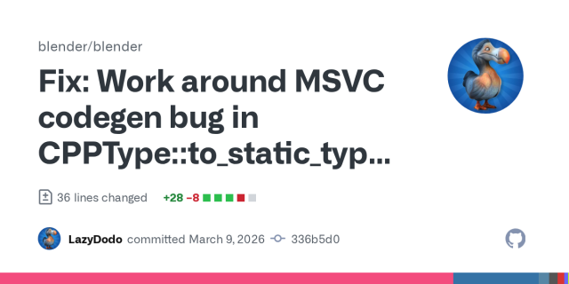 Fix: Work around MSVC codegen bug in CPPType::to_static_type_try · blender/blender@336b5d0